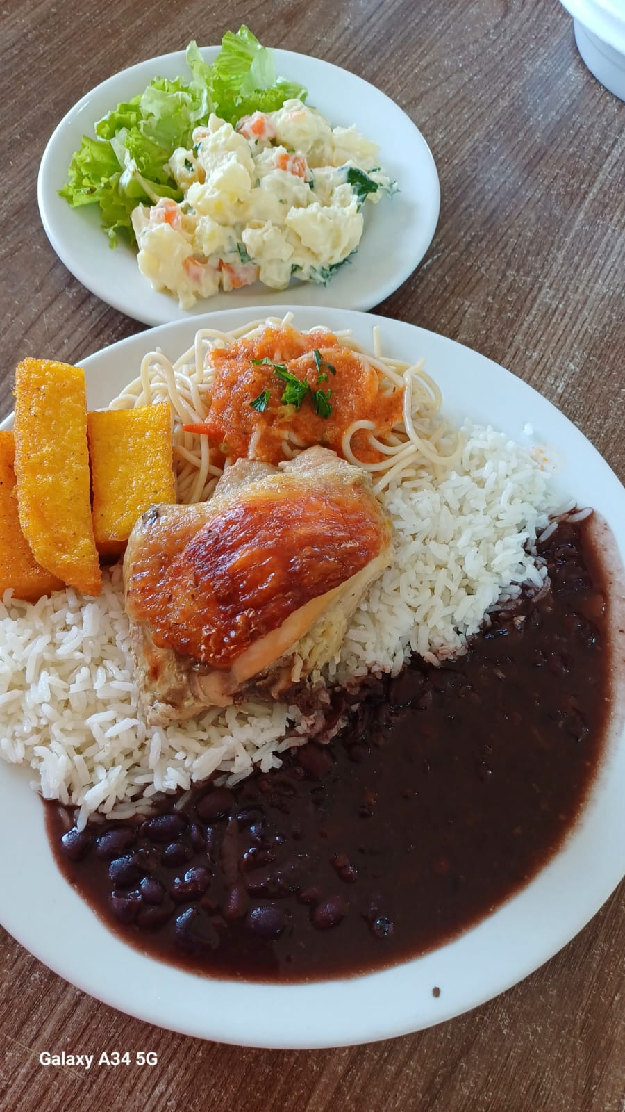 Frango grelhado suculento, arroz branco, feijão com tempero da casa, massa ao ponto e polentinha caseira frita.